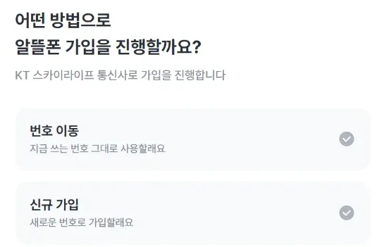 기존에 쓰던 번호 그대로 쓰시고 싶다면 ‘번호 이동’을 선택하시고 새로운 번호로 개통하시려면 ‘신규 가입’을 골라주세요.