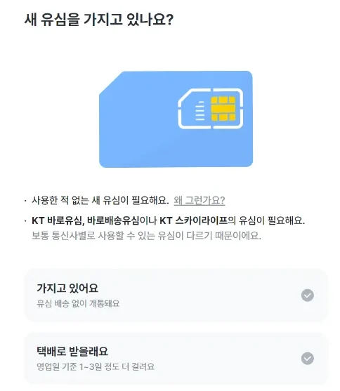하지만 기존에 쓰던 유심이 알뜰폰 업체 통신망이랑 일치한다면 ‘가지고 있어요’를 선택하시면 됩니다. 저는 기존 유심이 다른 망을 사용하고 있어서  ‘택배로 받을래요’를 선택했습니다.