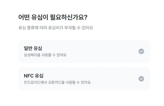 ‘일반 유심’을 고르시거나, 교통카드를 쓰셔야 하는 분이라면 NFC 유심을 고르시면 됩니다.