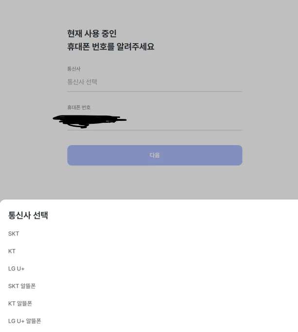 쓰고 있는 통신사와 자신의 번호를 입력합니다.