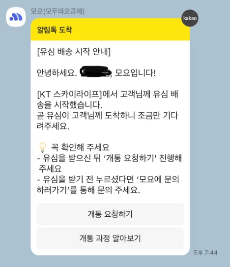 유심이 도착했다면, 이제 카톡으로 들어가셔서 모두의 요금에서 온 카톡 하단에 ‘개통 요청하기’를 눌러줍니다.