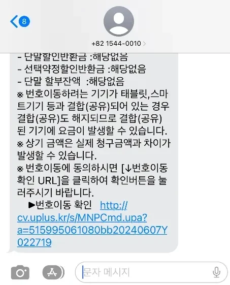 중간에 기존에 쓰던 업체에서 번호 이동하겠냐고 확인하는 문자가 날라옵니다. 이때 문자 하단에 있는 링크를 눌러 번호 이동을 확인시켜줍니다. 이걸 눌러도 아직 해지는 아니고 번호 이동하겠다는 의사만 알려주는 것입니다.