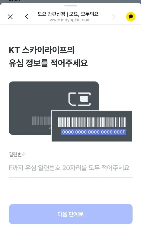 유심 카드 바코드에 적힌 일련번호를 입력합니다.