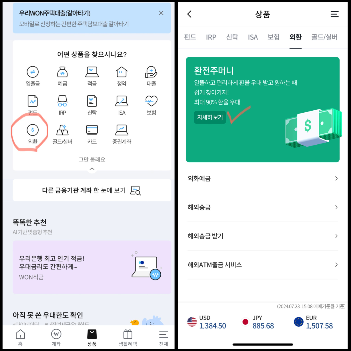 로그인하시면 하단에 <상품> 메뉴를 누르시면 상품 목록에 <외환> 항목을 클릭해 주세요. 그런 다음 맨 위에 있는 녹색 <환전주머니 배너>를 클릭해 주세요.